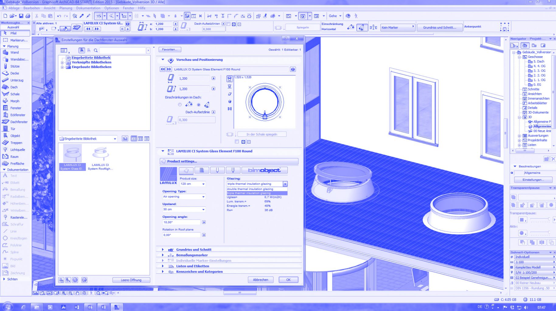 Die LAMILUX 3D-Modelle sind zumeist für die CAD-Systeme ArchiCAD und Revit und natürlich im IFC-Format verfügbar und lassen sich in der Planungsphase von Gebäuden direkt in die Planungssoftware importieren. Dadurch ist es möglich, bereits in einem frühen Stadium Planungsfehler zu vermeiden, Kosten zu reduzieren und mit dem späteren realen Design der Elemente zu planen. Inzwischen ist die Erzeugung von BIM-Daten schon im eigentlichen Produktentwicklungsprozess integriert. So wird neben der Konstruktion und Entwicklung der realen Produkte parallel die Erzeugung von BIM-Modellen angeschoben, sodass schon bei der Markteinführung der realen Produkte auch die digitalen Modelle bereitgestellt werden können. Bei diesen BIM-Modellen handelt es sich nicht nur um starre Geometrien oder Einzelmodelle, die in die CAD-Programme geladen werden können, sondern um parametrische Modelle, mit welchen eine breite Varianz der möglichen Produktausprägungen abgebildet wird. Noch komfortabler wird das mit dem Produktkonfigurator, den LAMILUX für Lichtkuppeln, Flachdachfenster und Komfortdachausstiege anbietet. Dort ist die Variantenvielfalt noch größer, und neben BIM-Modellen lassen sich auf Knopfdruck auch variantengenaue Datenblätter, Maßzeichnungen und Texte generieren.