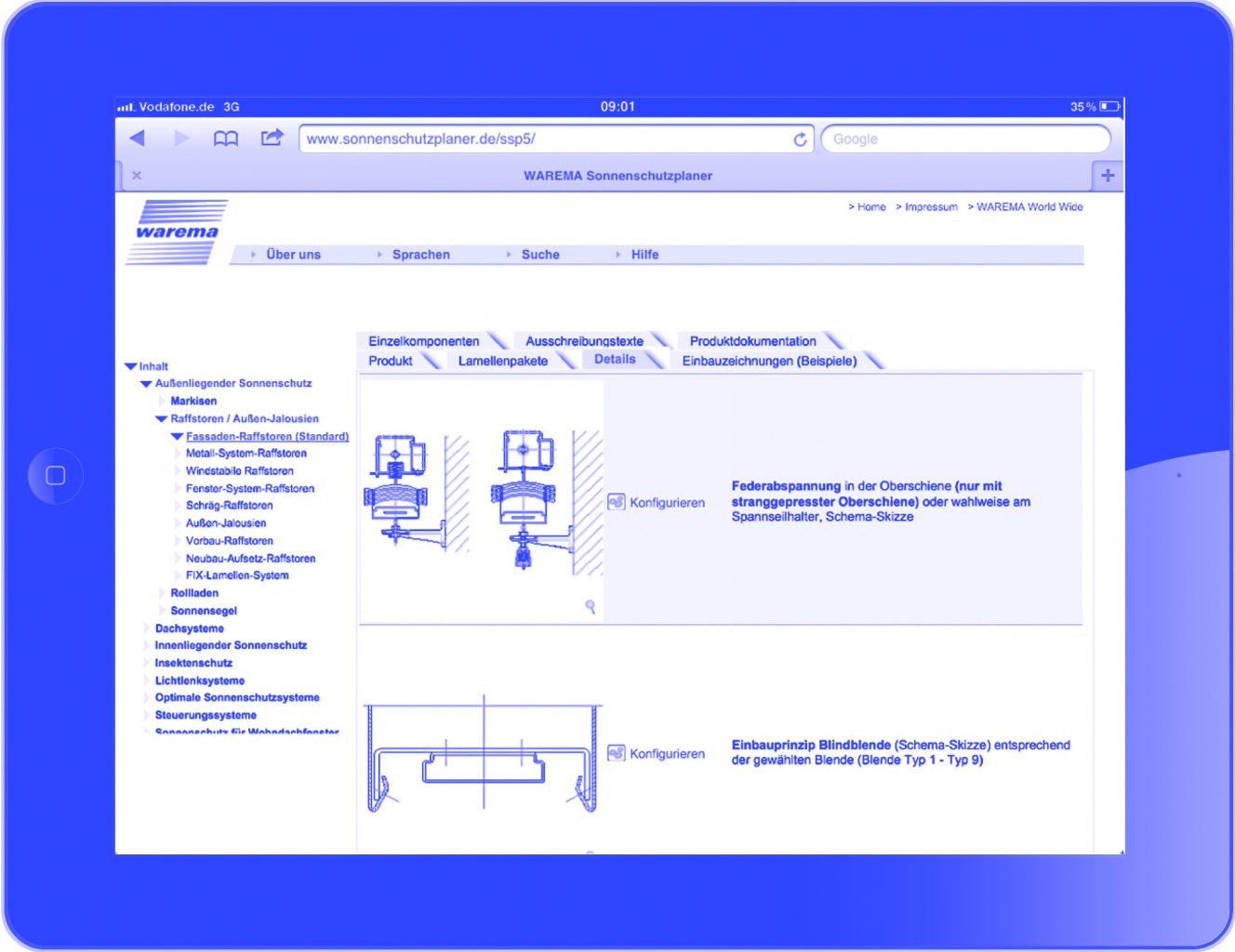 Als europäischer Marktführer für technische Sonnenschutzprodukte verfügt WAREMA über eine vielfältige Produktpalette mit passgenauen Lösungen für alle Anforderungen. Das Angebot reicht von außenliegendem Sonnenschutz wie Raffstoren, Rollläden und Fenster-Markisen und innenliegendem Sonnenschutz wie Jalousien, Rollos und Faltstores über Terrassen-Lösungen bis zu Steuerungssystemen für Bürogebäude oder das moderne Smart Home. Zahlreiche Referenzobjekte laden dazu ein, gute Lösungen kennenzulernen und in eigenen Planungen umzusetzen oder abzuwandeln.